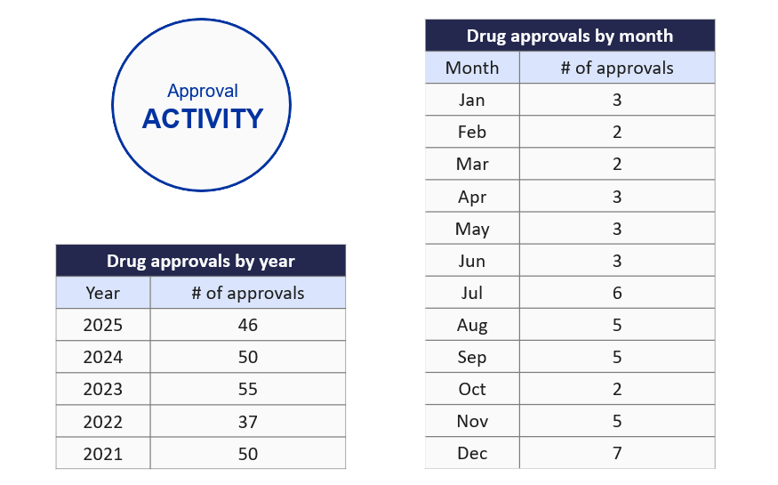 - The Food and Drug Administration (FDA) approved 46 novel drugs in 2025, four fewer than the amount approved in 2024.